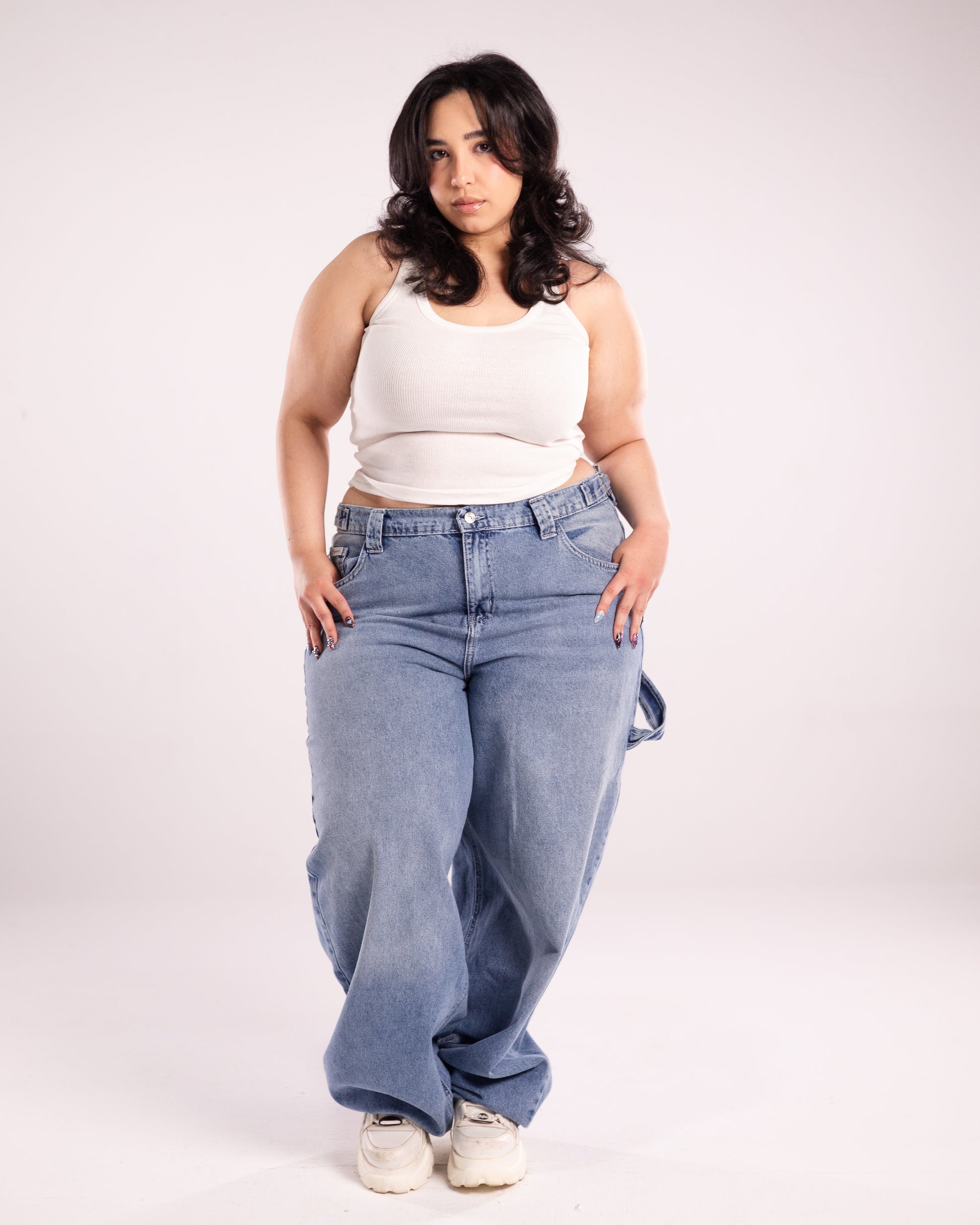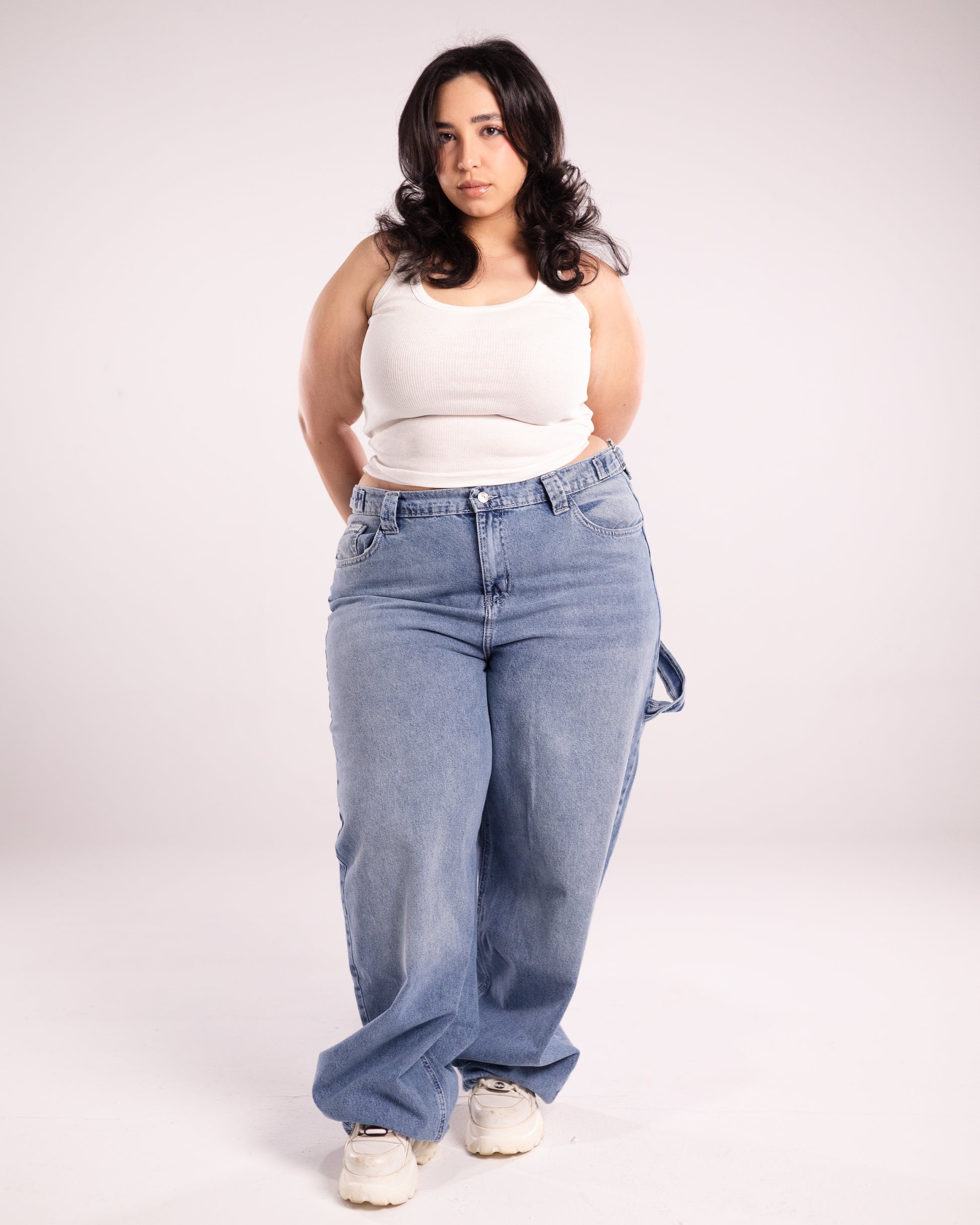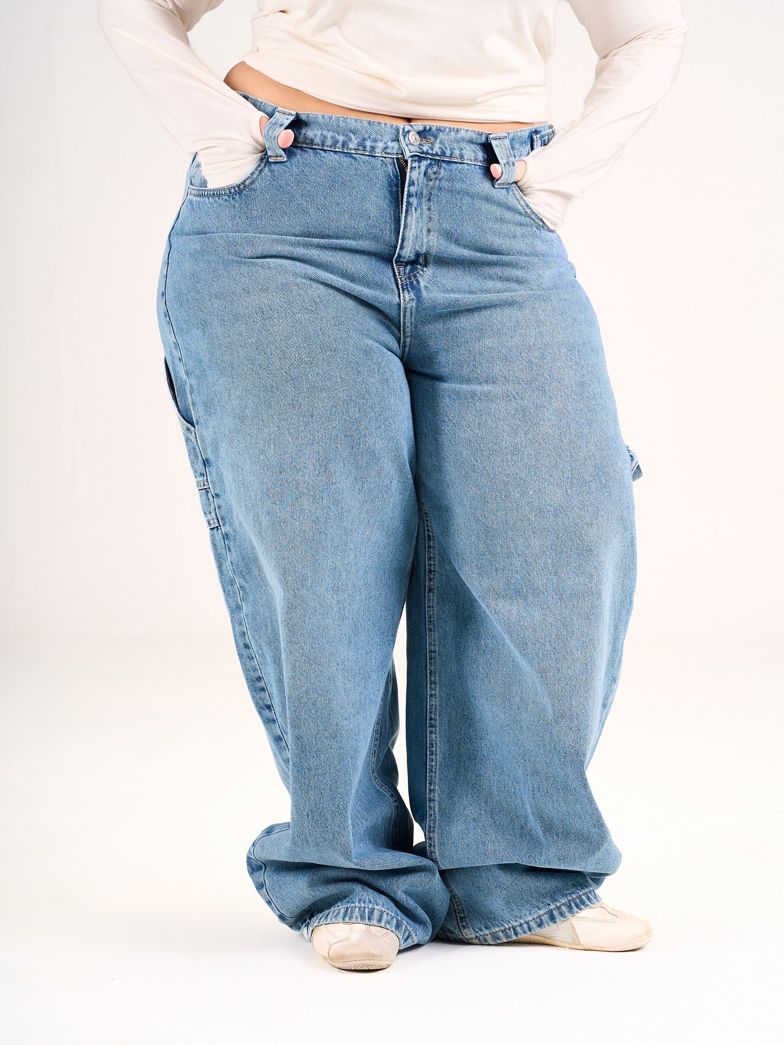 Carpenter jeans in a baggy fit with a built on belt to snatch your waist in the perfect shade of blue