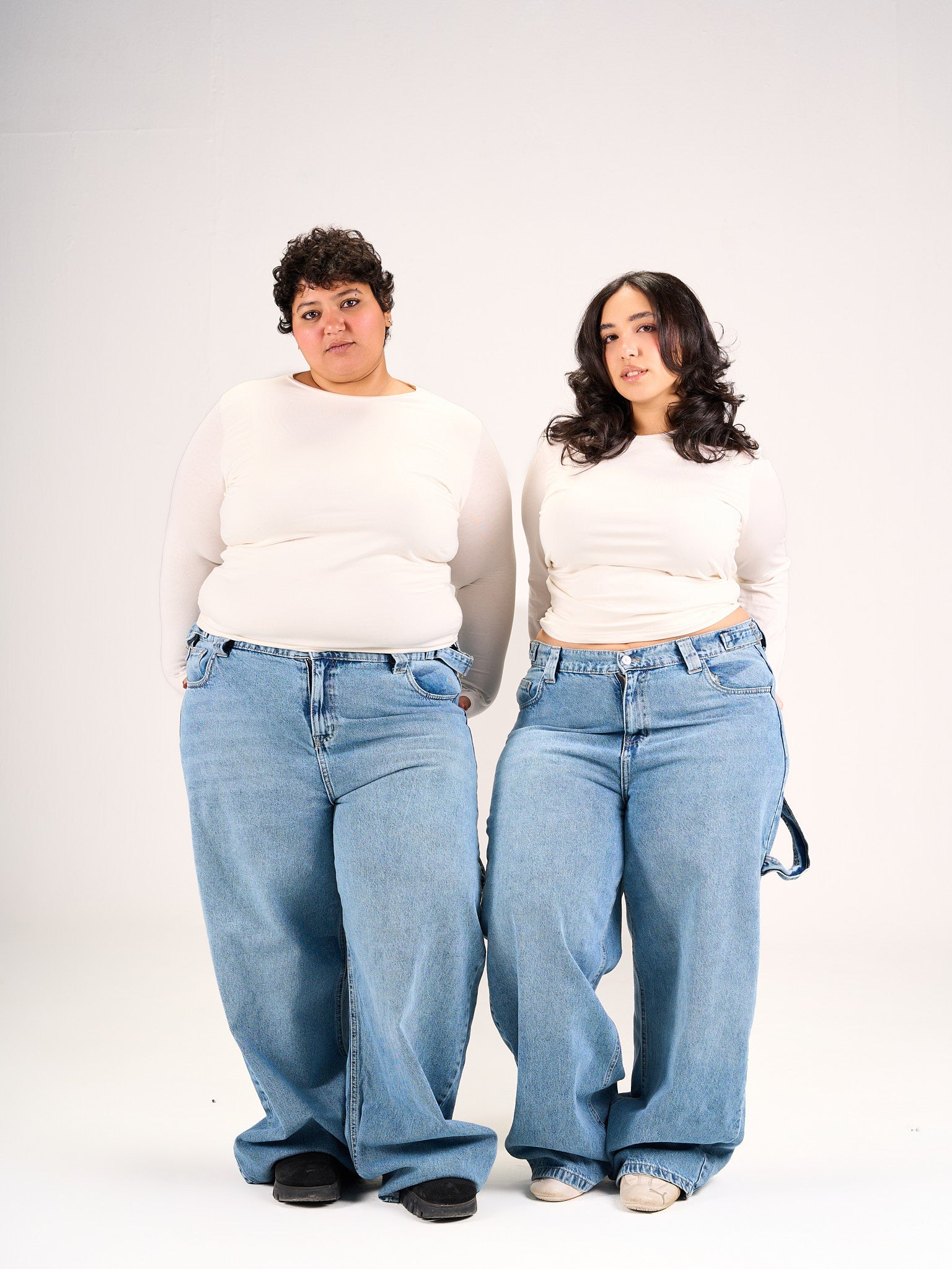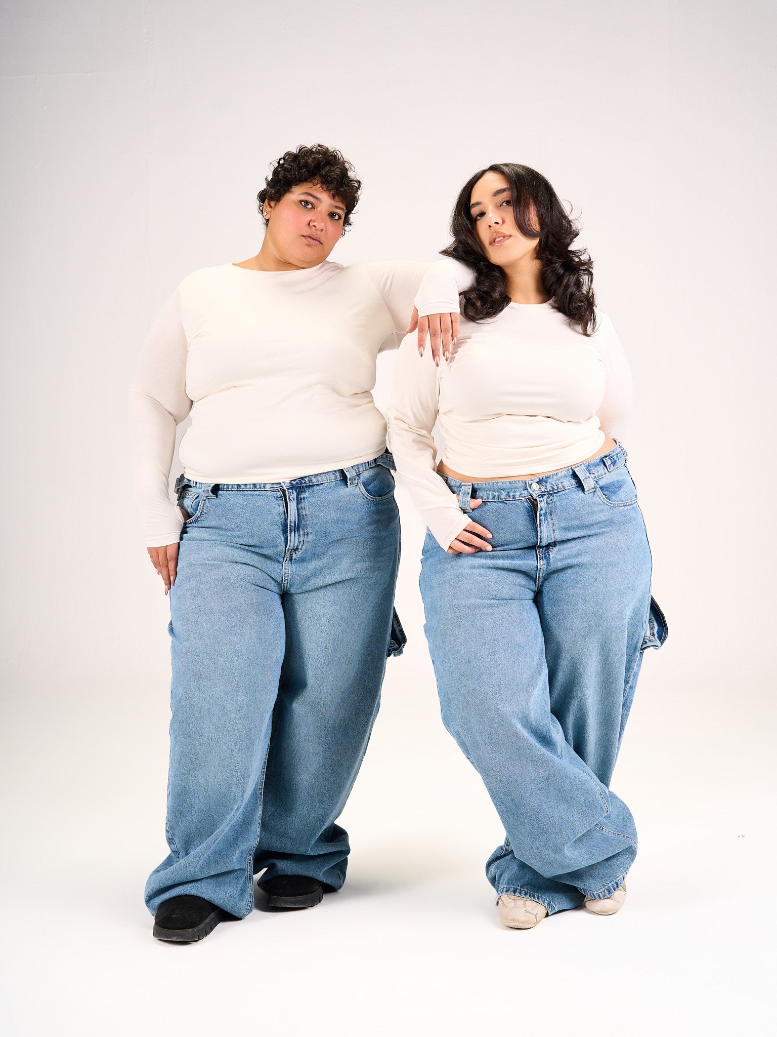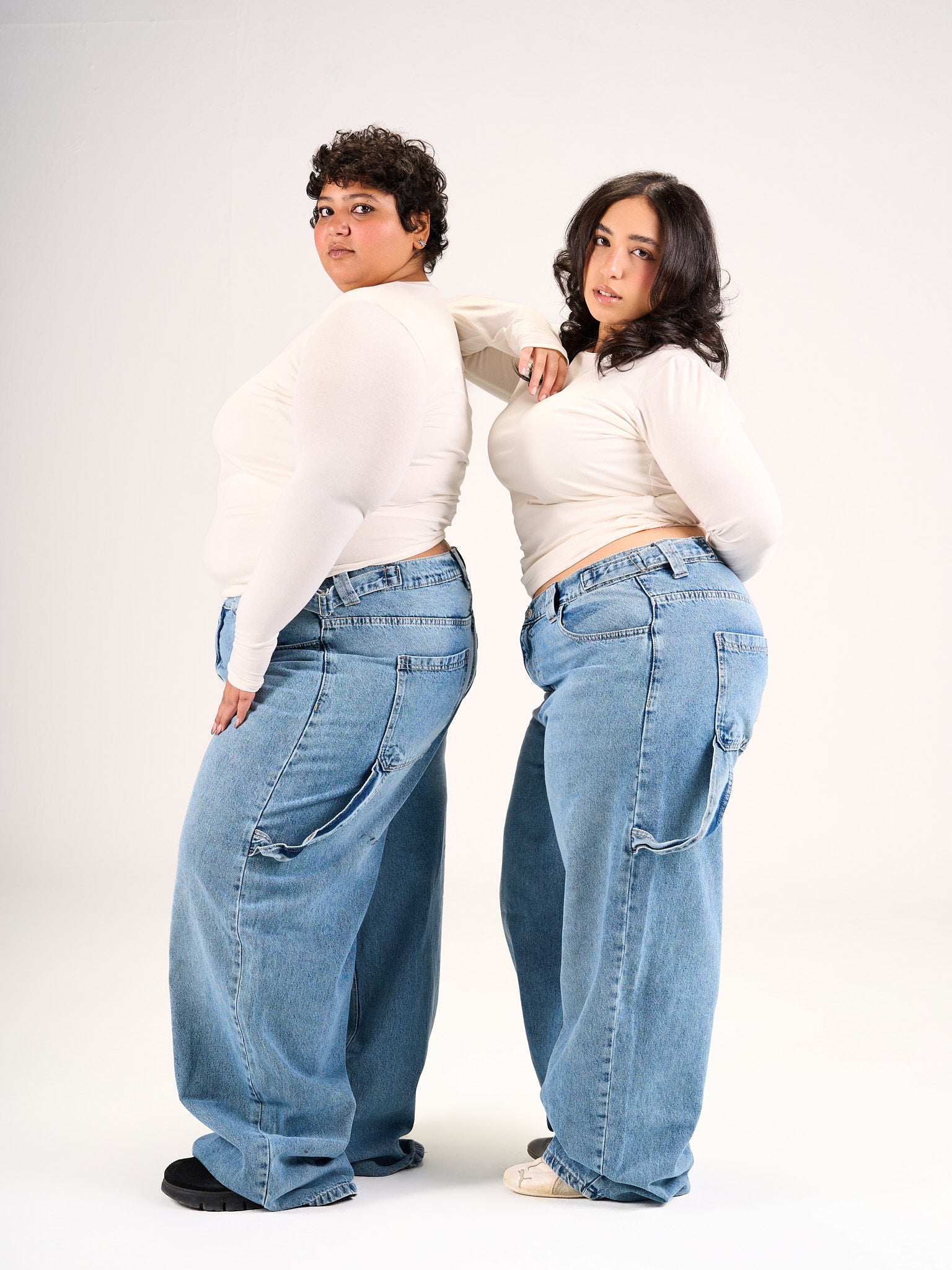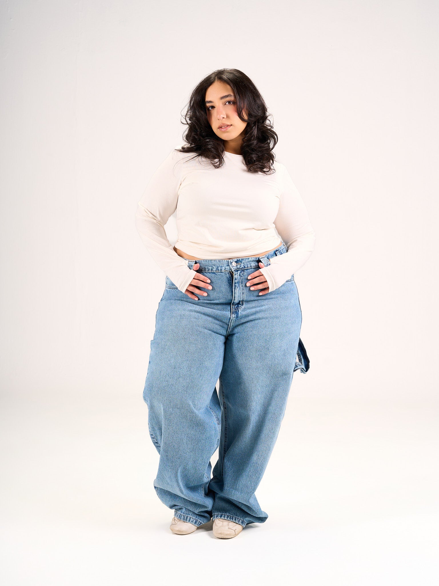 Carpenter jeans in a baggy fit with a built on belt to snatch your waist in the perfect shade of blue